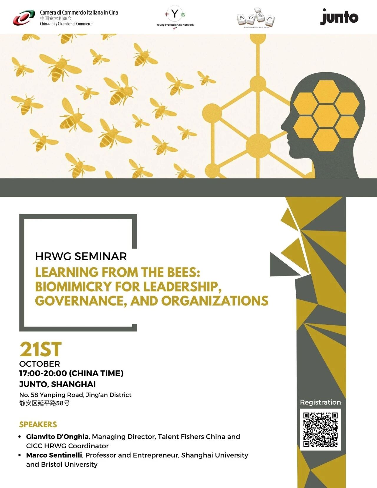 The China-Italy Chamber of Commerce (CICC) and its Human Resources Working Group (HRWG) are pleased to invite you to the first seminar “Learning from the Bees: Biomimicry for Leadership, Governance, and Organizations”, to be held on Tuesday, October 21st, 2025,  from 17:00 to 20:00 at Junto, Shanghai (No. 58 Yanping Road, Jing'an District - 静安区延平路58号).
