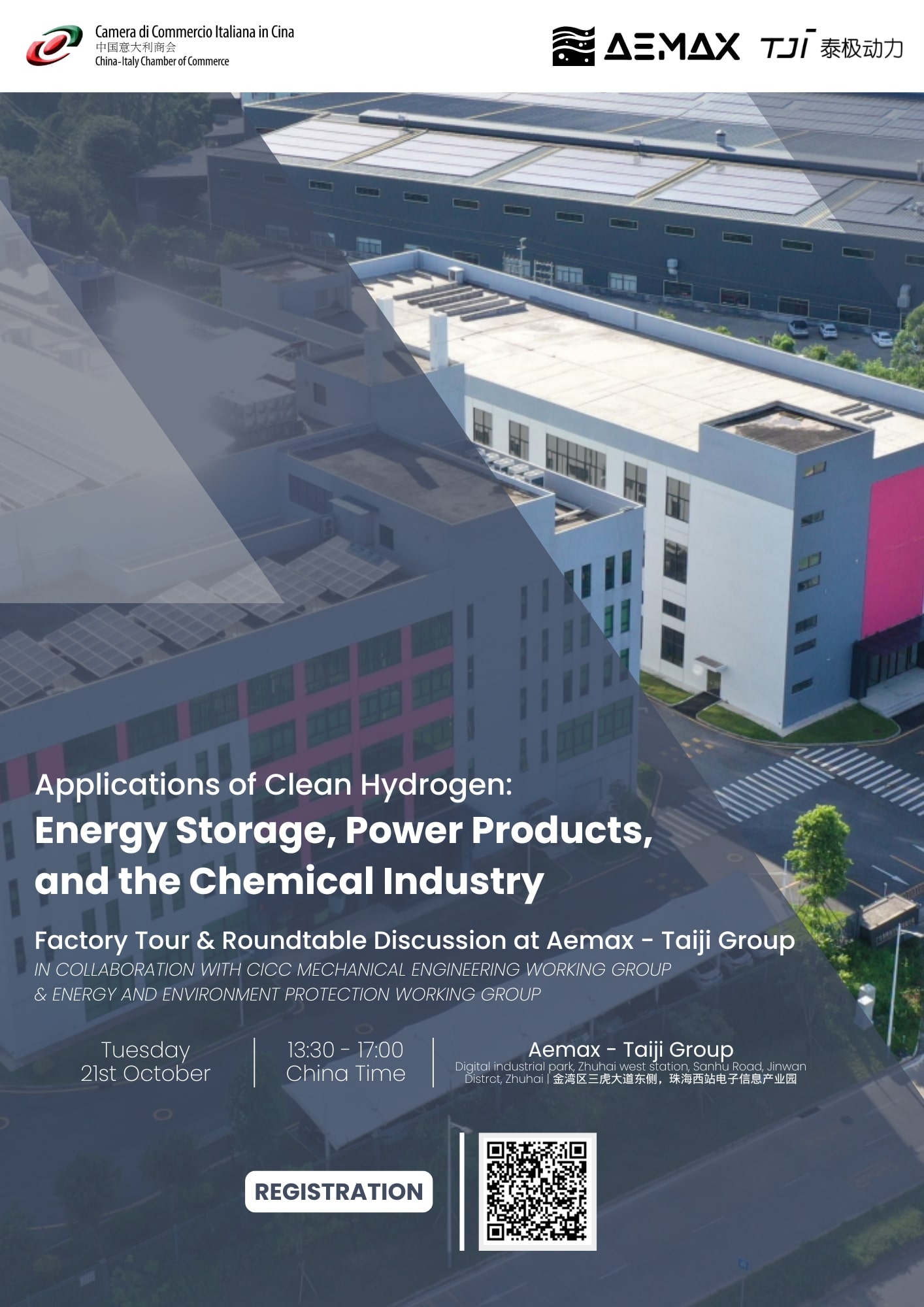 The China-Italy Chamber of Commerce (CICC), in collaboration with its Mechanical Engineering Working Group (MEWG) and Energy and Environment Protection Working Group (EEPWG), is delighted to announce an exclusive Factory Tour and Roundtable at Aemax - Taiji Group in Zhuhai  with the theme "Applications of Clean Hydrogen: Energy Storage, Power Products, and the Chemical Industry".