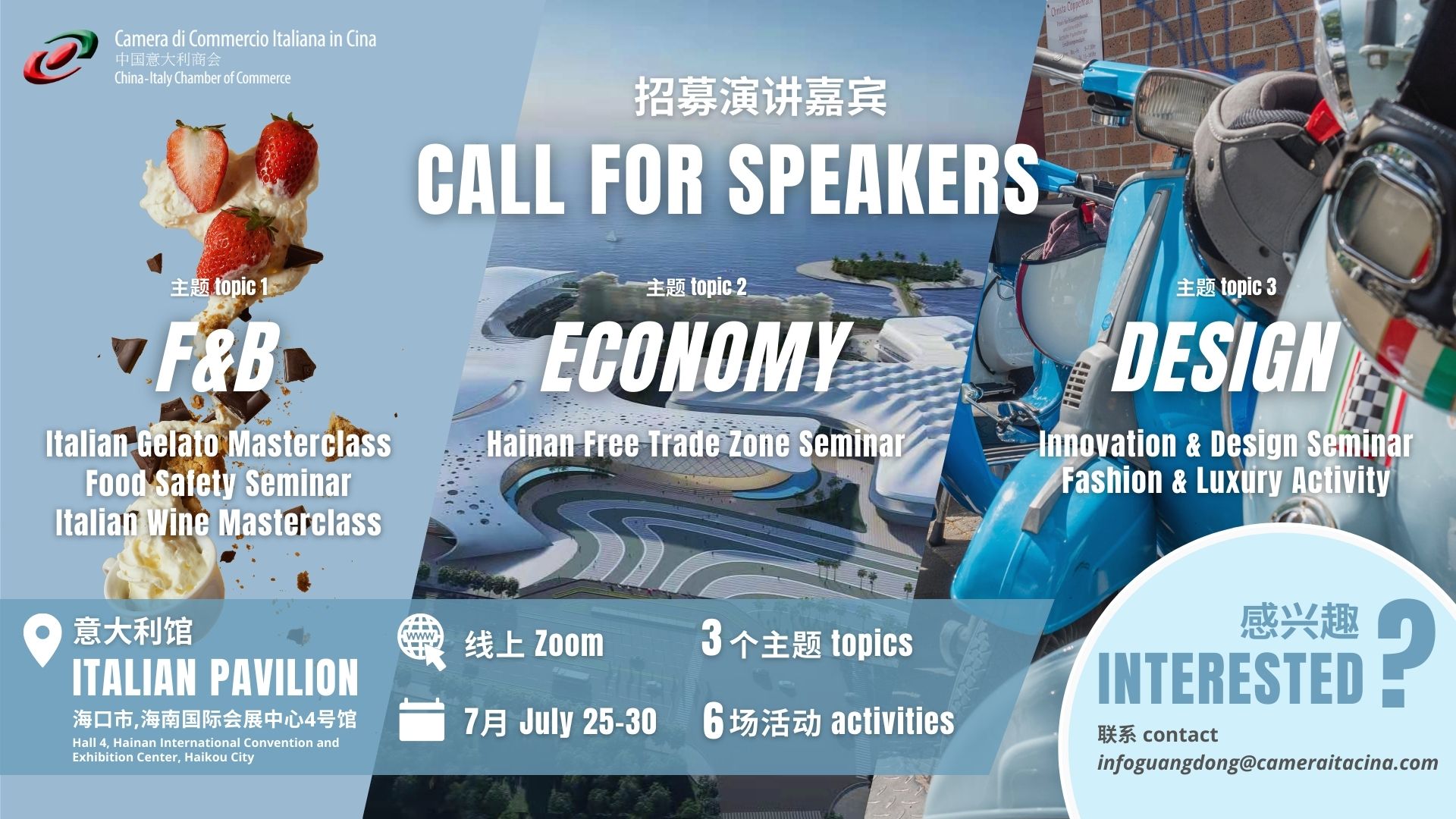 The China-Italy Chamber of Commerce (CICC) is looking for speakers for 6 upcoming activities on the occasion of the China International Consumer Products Expo, which will be held at Hainan International Convention and Exhibition Center in Haikou (Hainan Province) from July 25th to 30th, 2022.