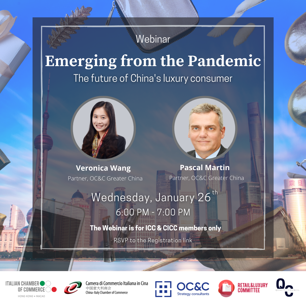 The Italian Chamber of Commerce in Hong Kong and Macao and the China-Italy Chamber of Commerce (CICC), supported by their Retail & Luxury Committee and Quality Council, are pleased to invite you to the webinar “Emerging from the Pandemic - The Future of China’s Luxury Consumer”.