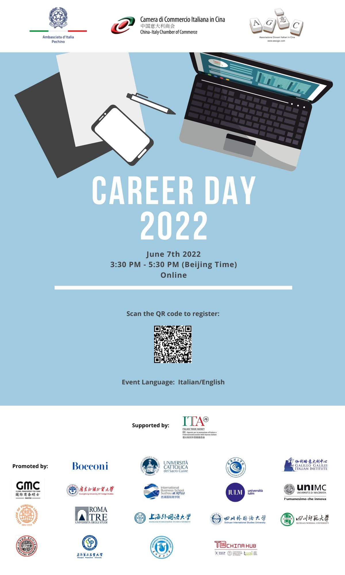 The Career Day is organized together with the Embassy of Italy to the P.R.C. and AGIC (Associazione Giovani Italiani in Cina) and with the support of the Italian Trade Agency.