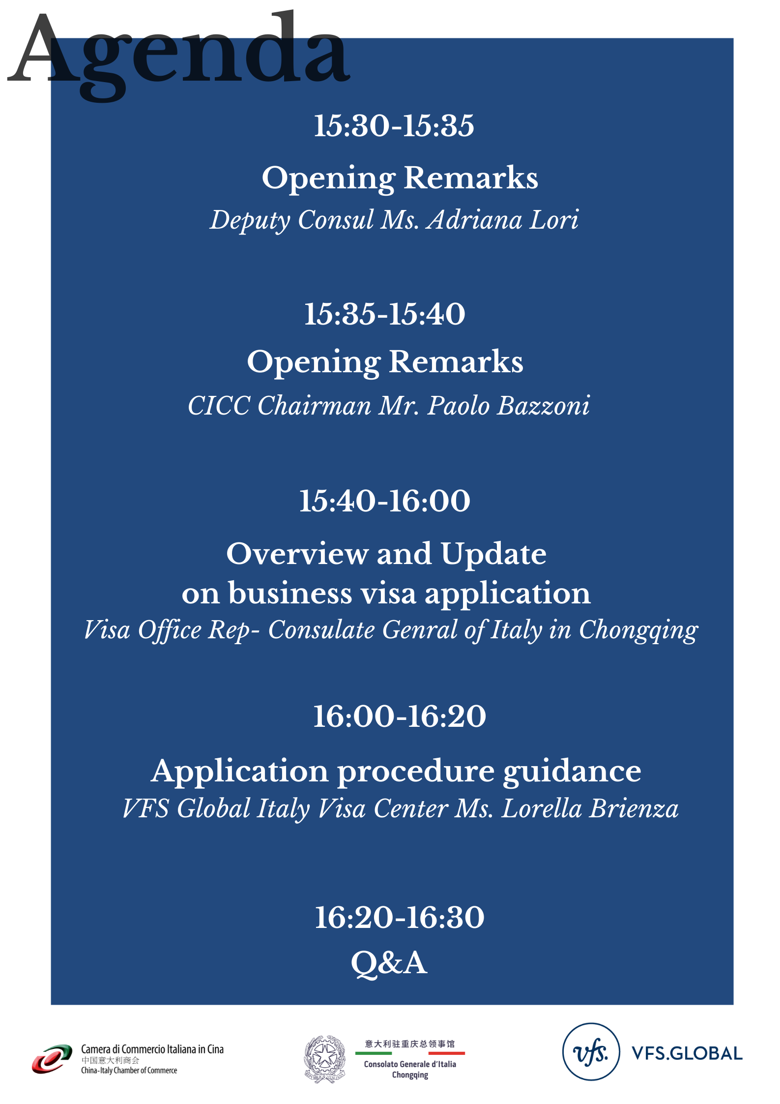 我们很荣幸地邀请到了意大利驻重庆领事馆签证处代表为我们具体介绍疫情期间意大利商务签证申请政策的大体情况和政策更新。接着,来自VFS GLOBAL签证中心的刘星月女士将进一步介绍意大利签证申请的具体操作流程。