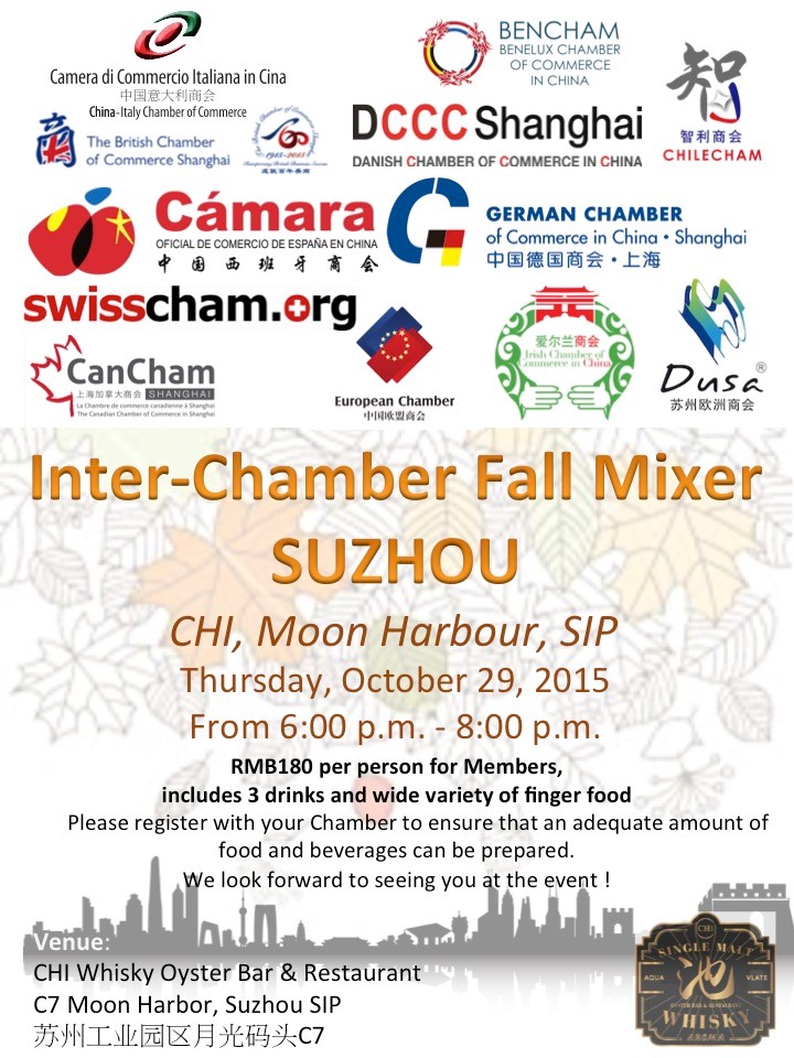 China Italy Chamber of Commerce (CICC) is delighted to invite all of its Members to take part to the Inter-Chamber Fall Mixer in Suzhou. Do not miss the chance to join us for a fun night of networking!