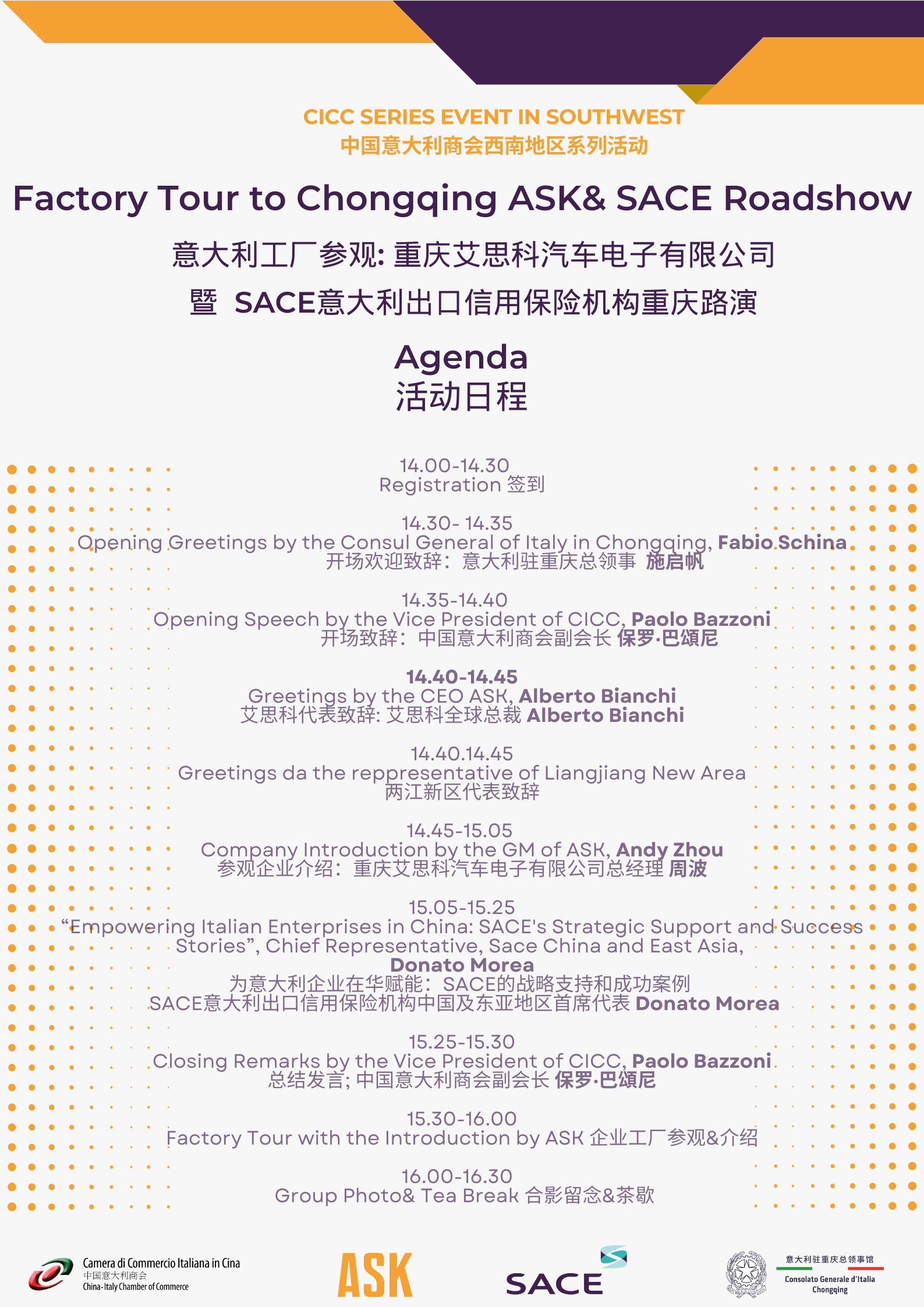 中国意大利商会很荣幸地邀请您参加于11月14日星期四举办的意大利工厂参观:重庆艾思科汽车电子有限公司&SACE意大利出口信用保险机构重庆路演.