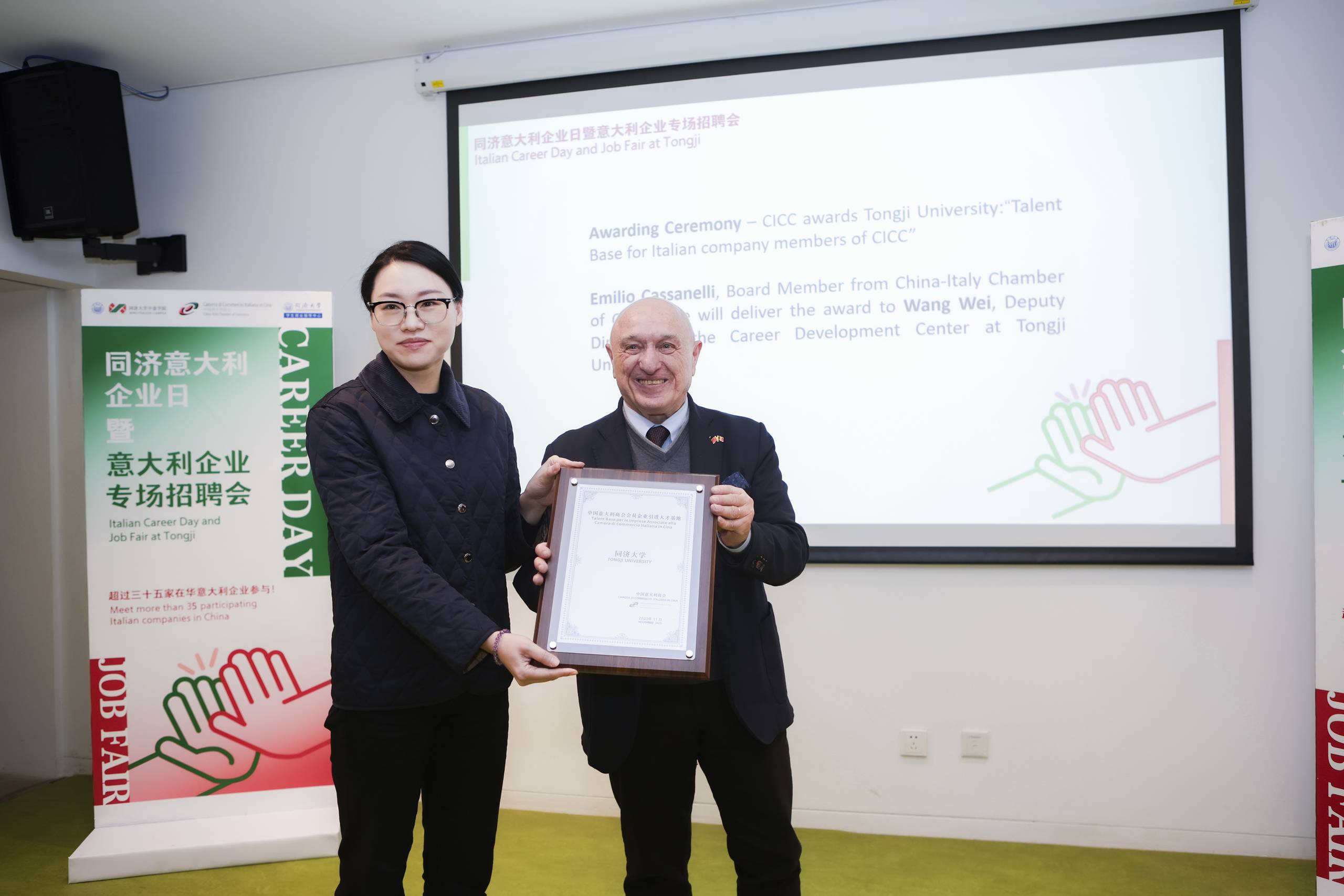 During the event, the CICC conferred Tongji University with the award: “Talent Base for Italian company members of CICC”. Emilio Cassanelli delivered the award to Wang Wei, Deputy Director of the Career Development Center at Tongji University.