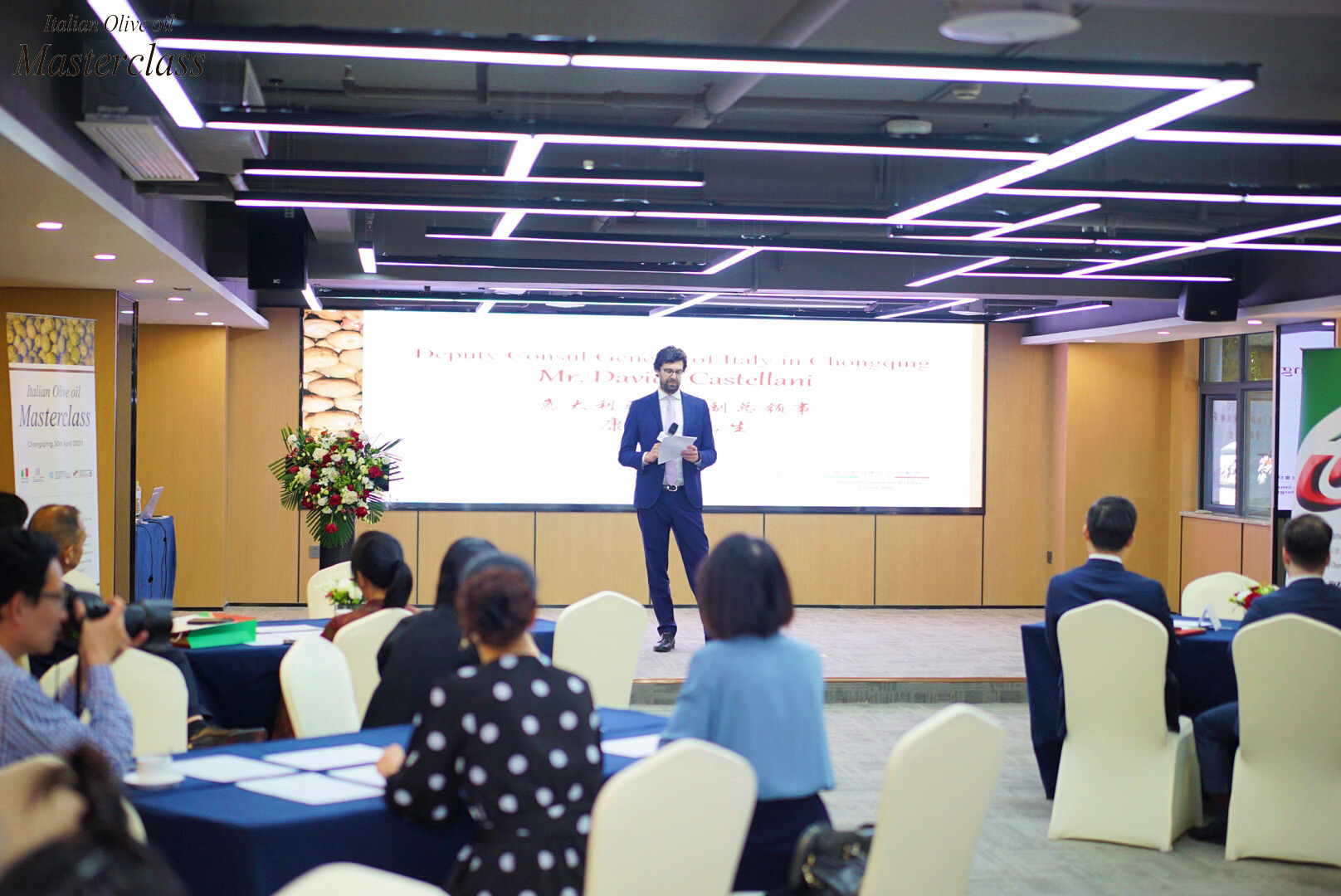 活动开幕式由意大利驻重庆总领事馆副总领事康达城先生、中国意大利商会会长保罗巴颂尼先生分别为此次活动致欢迎辞。康达城先生在讲话中谈到了了中国市场上的“意大利制造”产品,并强调识别产品原产地的重要性。 保罗巴颂尼先生通过视频预祝本次意大利橄榄油大师班活动圆满成功,另外他强调,意大利在优质农业食品生产方面在欧洲排名第一,希望在中国和意大利之间进行越来越多的餐饮业建设性交流。