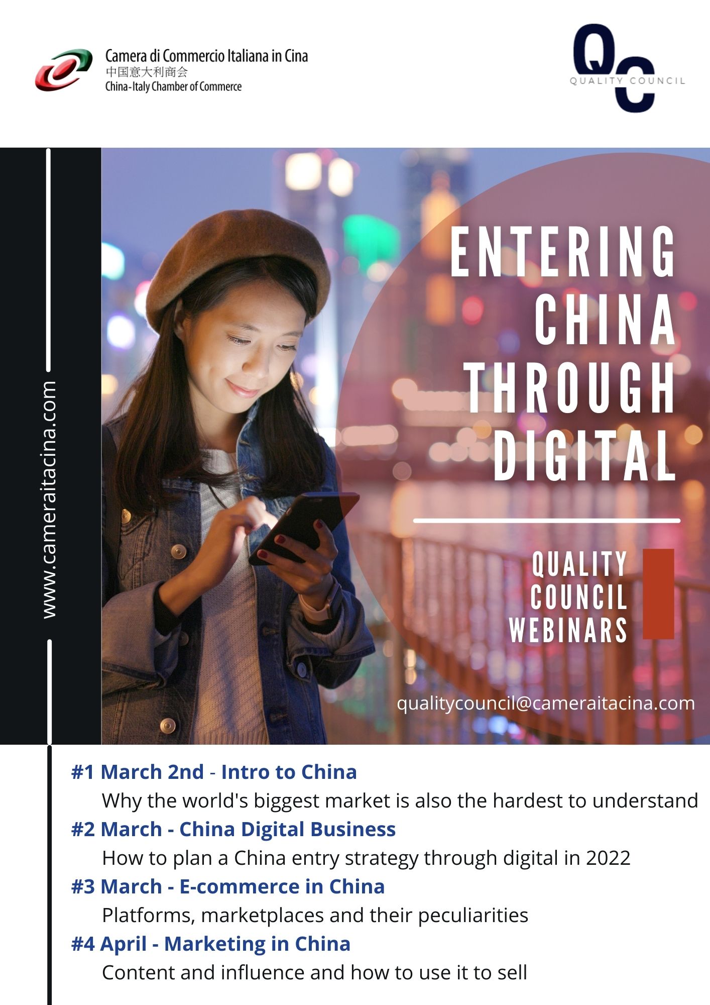 The China-Italy Chamber of Commerce’s Quality Council is pleased to invite you to the series of seminars “Entering China through Digital”. The four-session course is aimed at export managers and digital business developers in the West who are looking to unlock the secrets of the world’s biggest consumer market, China.