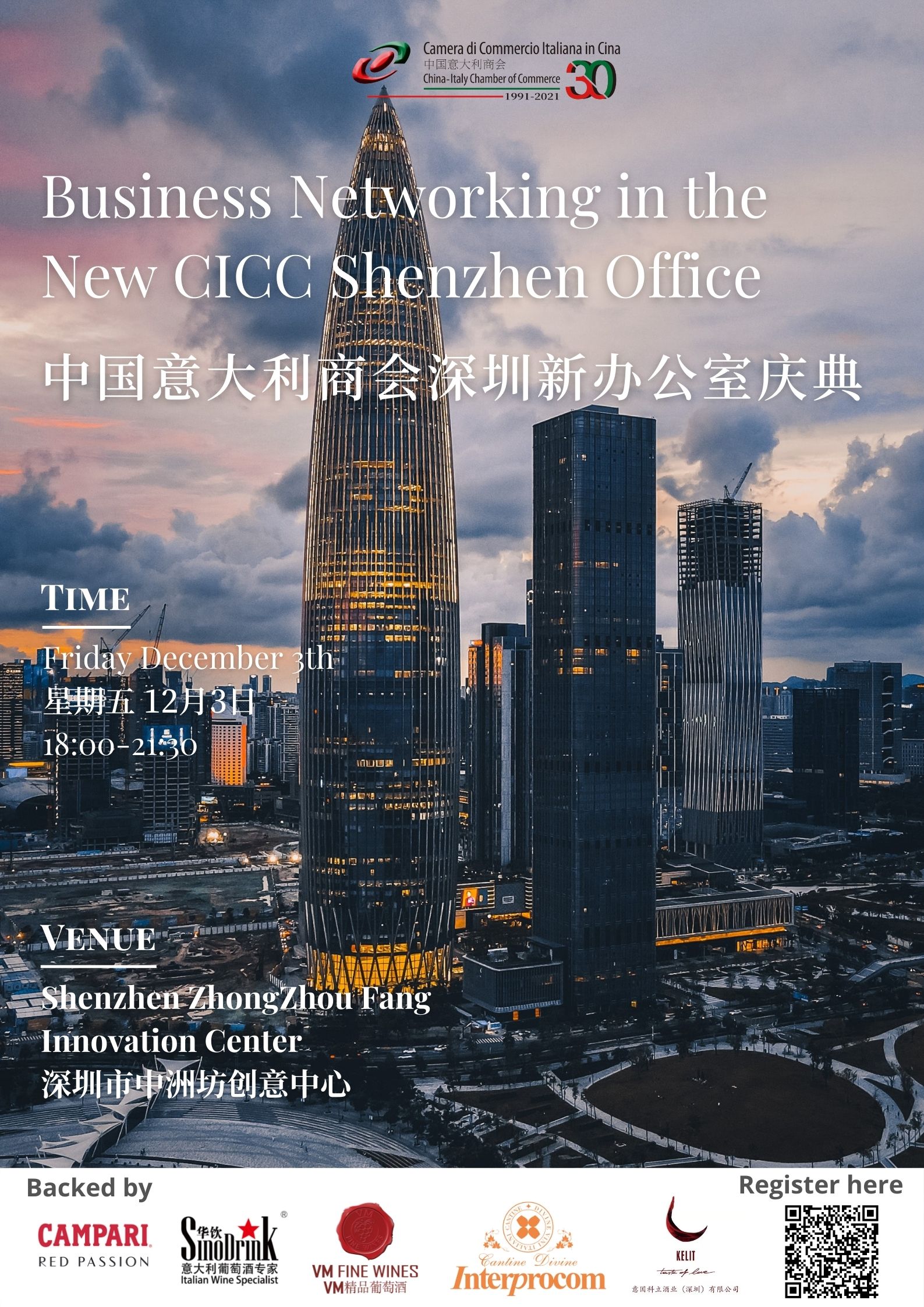 The China-Italy Chamber of Commerce (CICC) cordially invites you to the next Business Networking in the New CICC Shenzhen Office that will be held on next December 3rd from 19.30, at Shenzhen ZhongZhou Fang Innovation Center 深圳中洲坊创意中心.