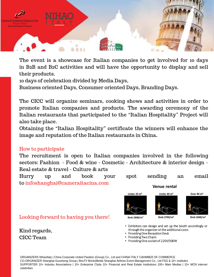 Be part of a network of over 500 Italian and Foreign companies in China and abroad. Gain greater exposure through sponsorships, collaboration opportunities and advertising on the CICC's website.