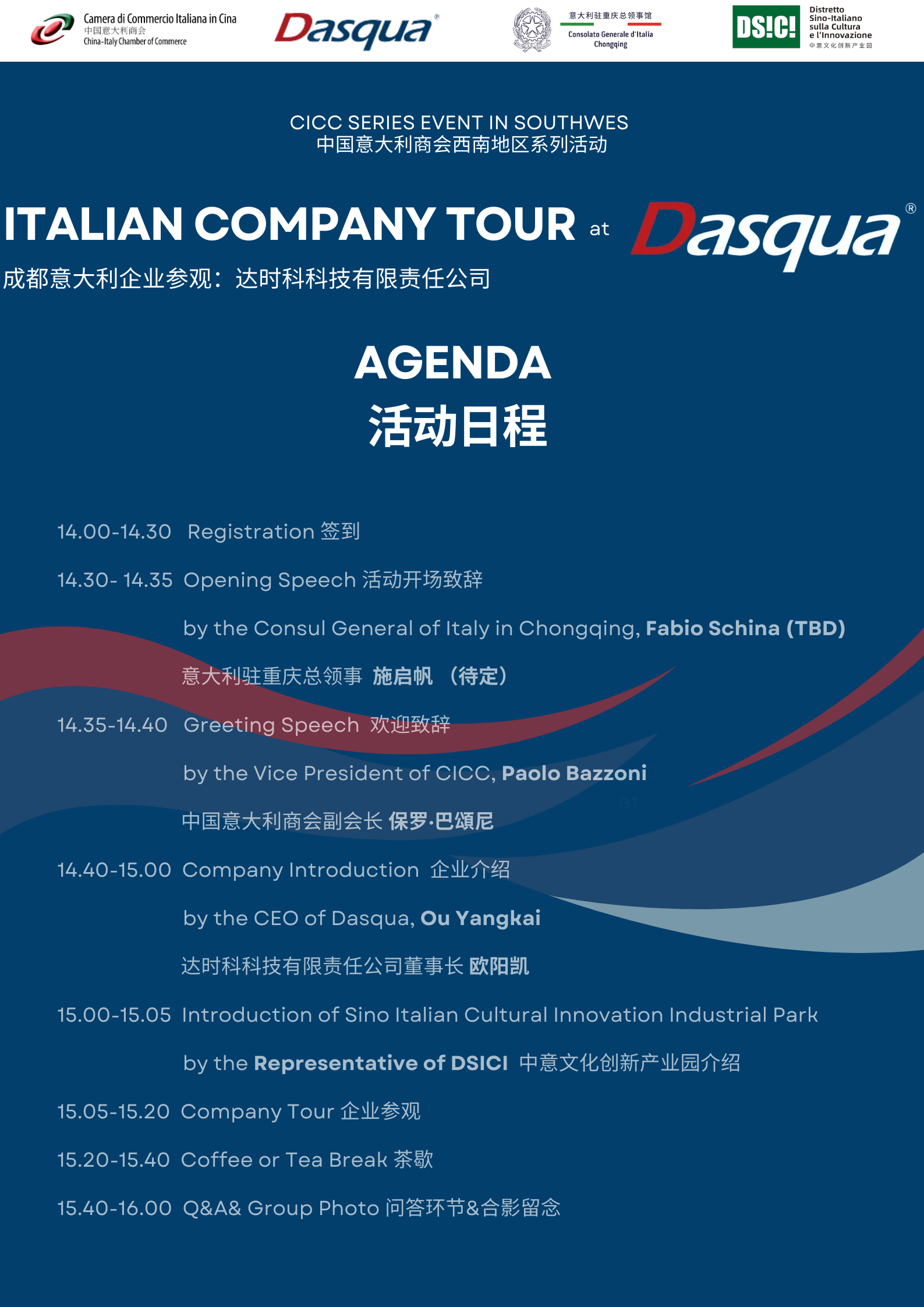 The China-Italy Chamber of Commerce (CICC) is glad to invite you to the Italian Company Tour in Chengdu at Dasqua on September 26th.