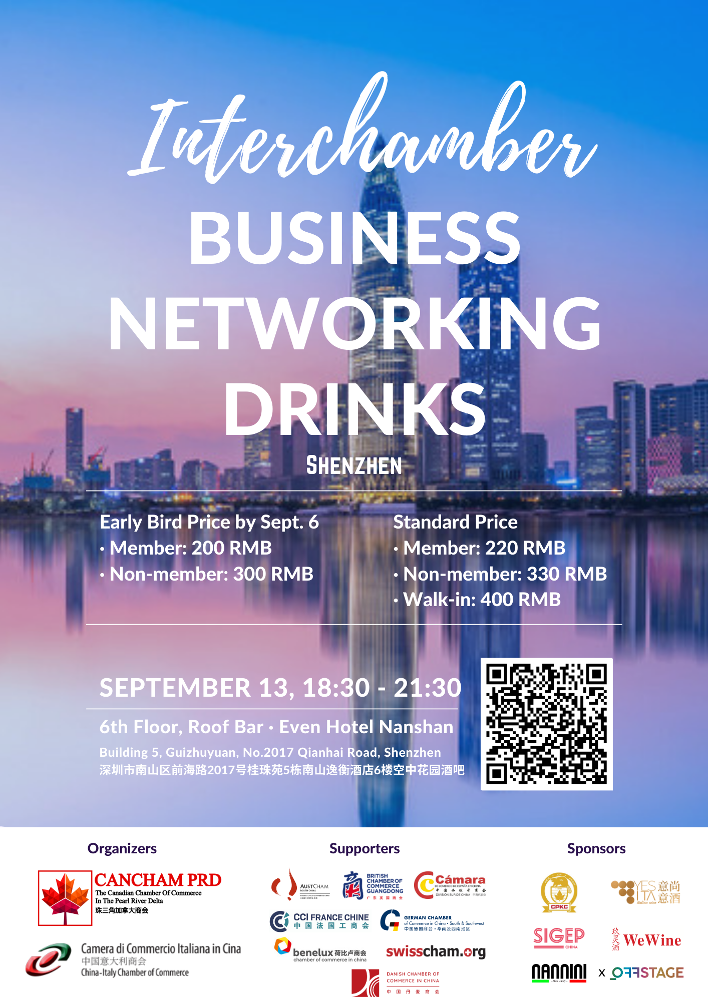 The China-Italy Chamber of Commerce (CICC) is glad to invite you to Shenzhen Interchamber Networking Drinks that will be held at Even Hotel Shenzhen Nanshan (深圳南山逸衡酒店) on Wednesday, September 13th, from 18:30 to 21:30.