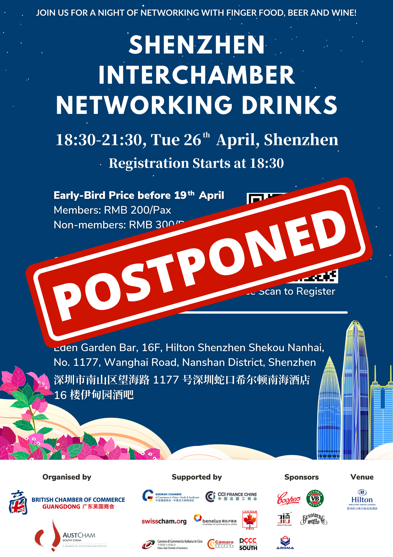 The China-Italy Chamber of Commerce (CICC) regrets to inform you that, due to the current Covid-19 situation, “Shenzhen Interchamber Networking Drinks”, originally scheduled for April 26th 2022, has been postponed to a future date.