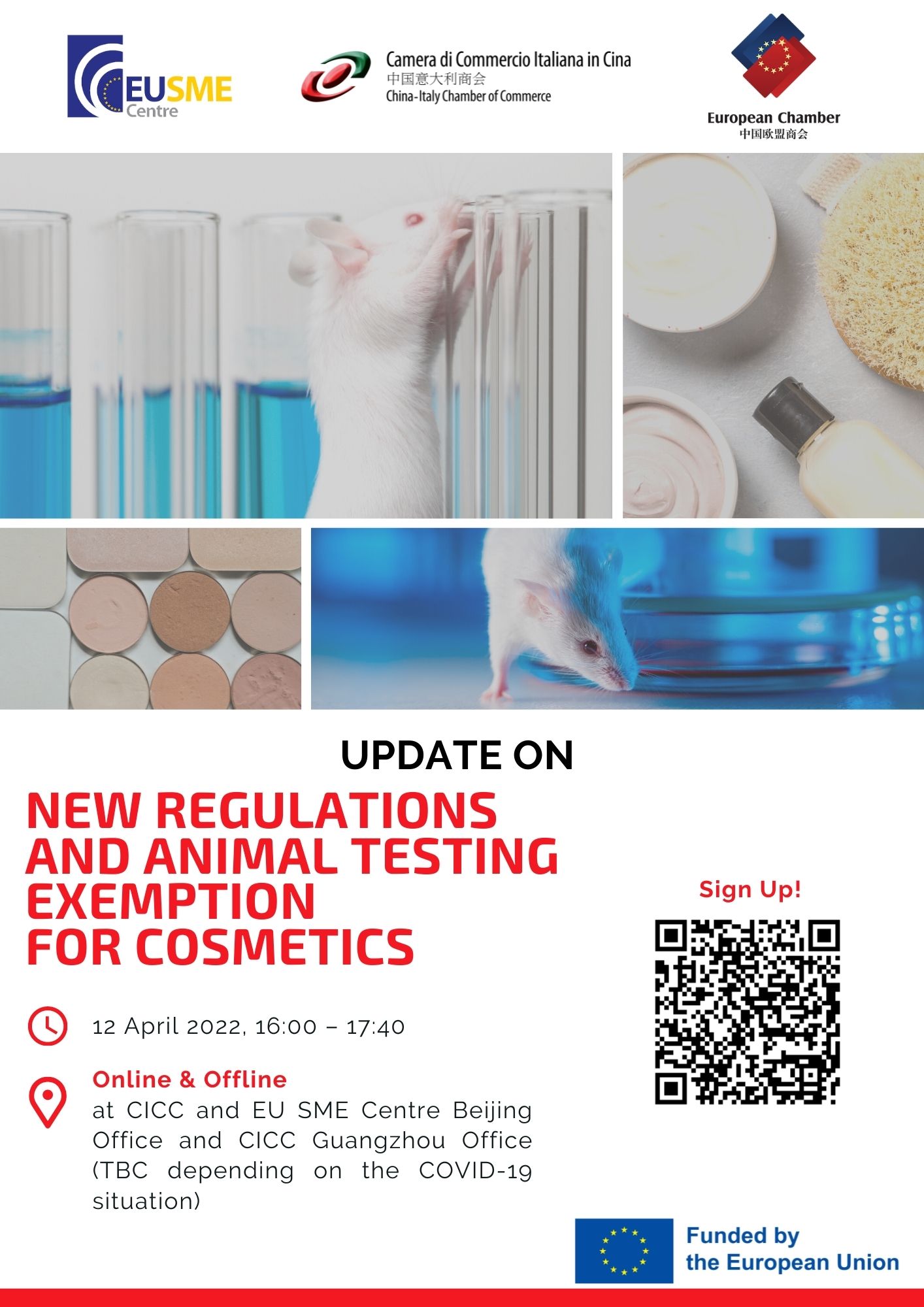 The China-Italy Chamber of Commerce (CICC) together with the EU SME Centre and the European Union Chamber of Commerce in China invite you to attend the seminar "New Regulations and Animal Testing Exemption for Cosmetics", to be held next April 12, 2022 ONLINE and OFFLINE (CICC Beijing Office and CICC Guangzhou Office, see address below).