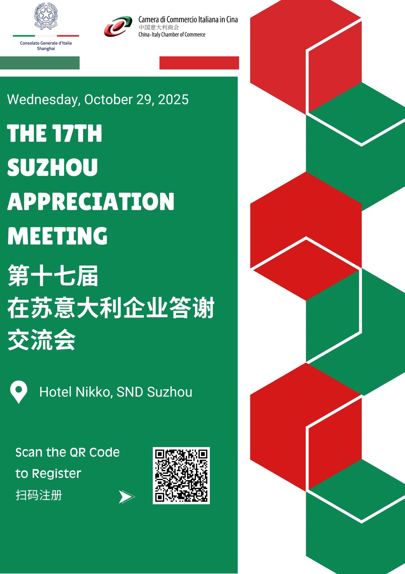 The event will take place on October 29, 2025, at the Hotel Nikko Suzhou, and will be attended by Ms. Tiziana D’Angelo, Consul General of Italy in Shanghai, and Mr. Giulio Bolaffi, Counsellor and Head of the Economic and Commercial Office at the Embassy of Italy to the P.R.C.