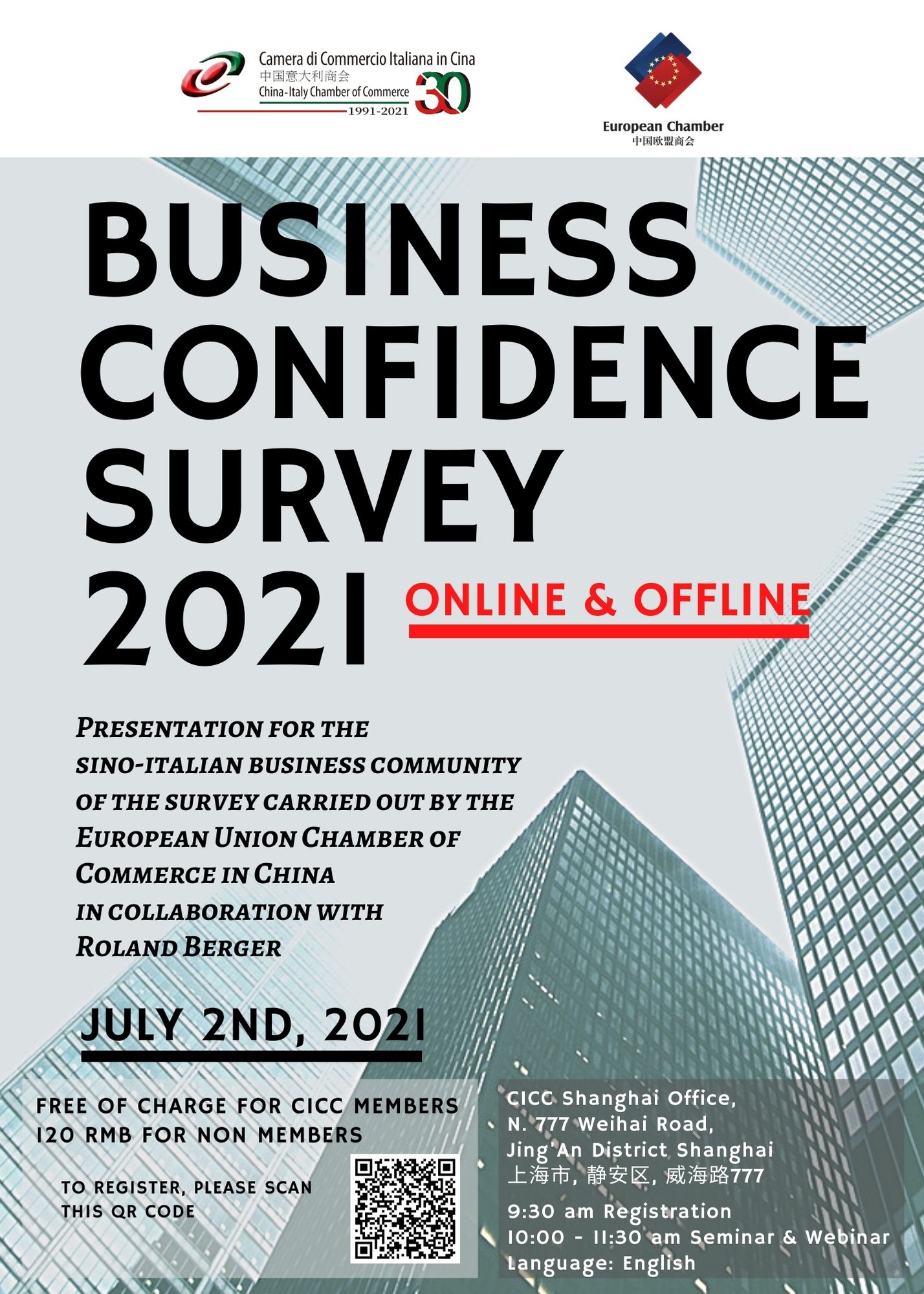 The China-Italy Chamber of Commerce is pleased to inform you that, thanks to the support of Italian members of the EUCCC Governance Bodies, we will present and discuss the European Business in China Business Confidence Survey 2021 (BCS) on Friday 2 July from 10:00 to 11:30 am at our Shanghai Office. The meeting is organized for the Sino-Italian business community.