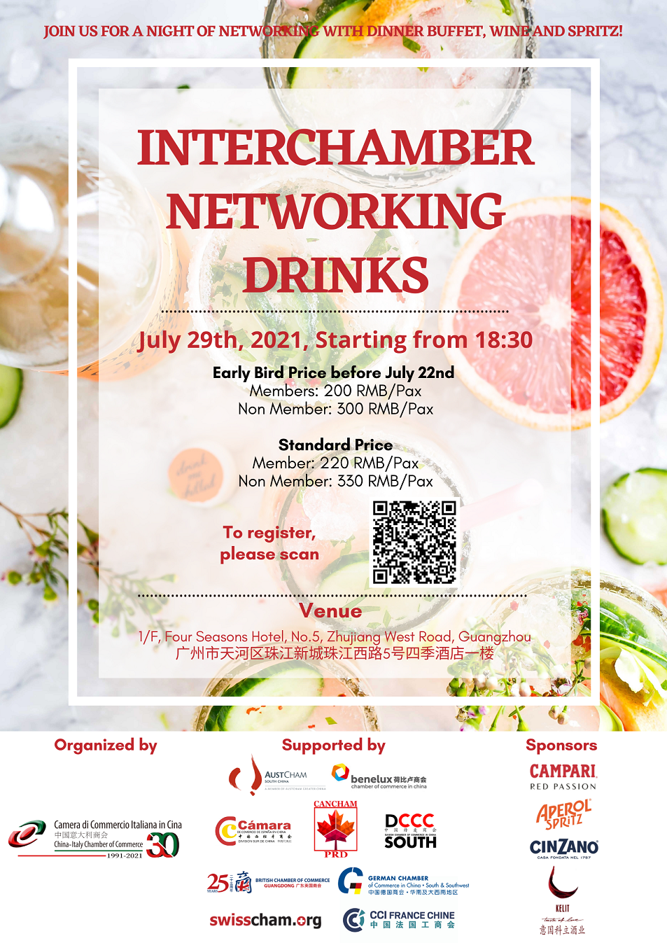 The China-Italy Chamber of Commerce (CICC), in cooperation with the British Chamber of Commerce Guangdong, the Australian Chamber of Commerce - South China, the Benelux Chamber of Commerce in China, the French Chamber of Commerce and Industry in China, the German Chamber of Commerce - South and Southwest China, the Swiss Chinese Chamber of Commerce in China, the Danish Chamber of Commerce in South China, the Spanish Chamber of Commerce in China and the CanCham PRD, is glad to invite you to the Interchamber Business Networking which will be held in Guangzhou on 29th July.