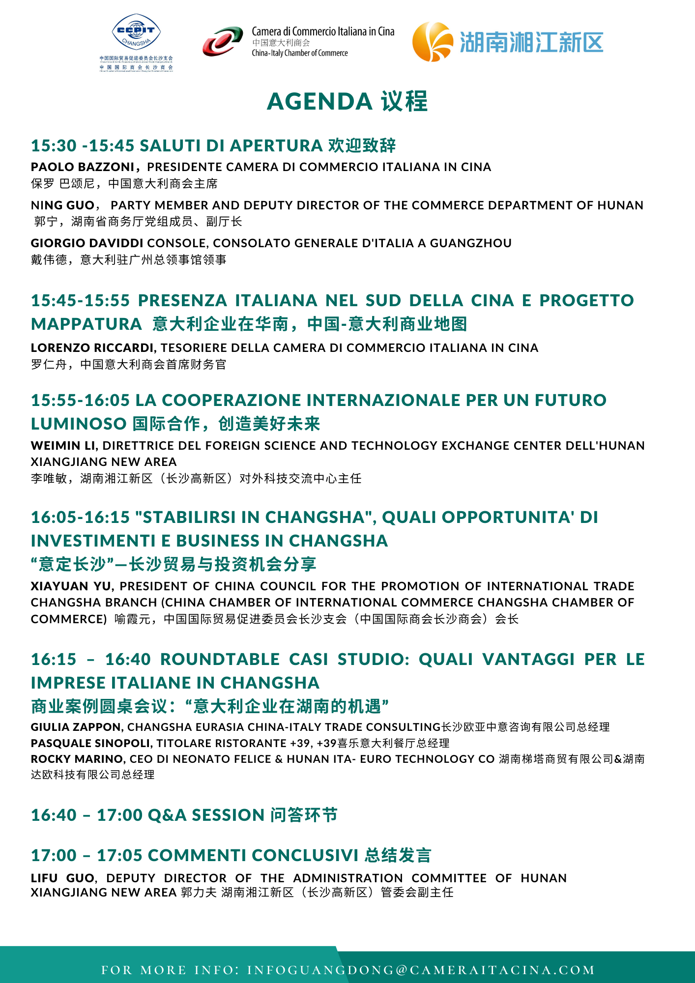 L’evento è organizzato dalla Camera di Commercio Italiana in Cina con il supporto della European Affairs Division of Foreign Affairs Office of the People's Government of Hunan Province, il China Council for the Promotion of International Trade Changsha Branch (CCPIT Changsha) e l'Administrative Committee of Changsha High-Tech Industrial Development Zone.