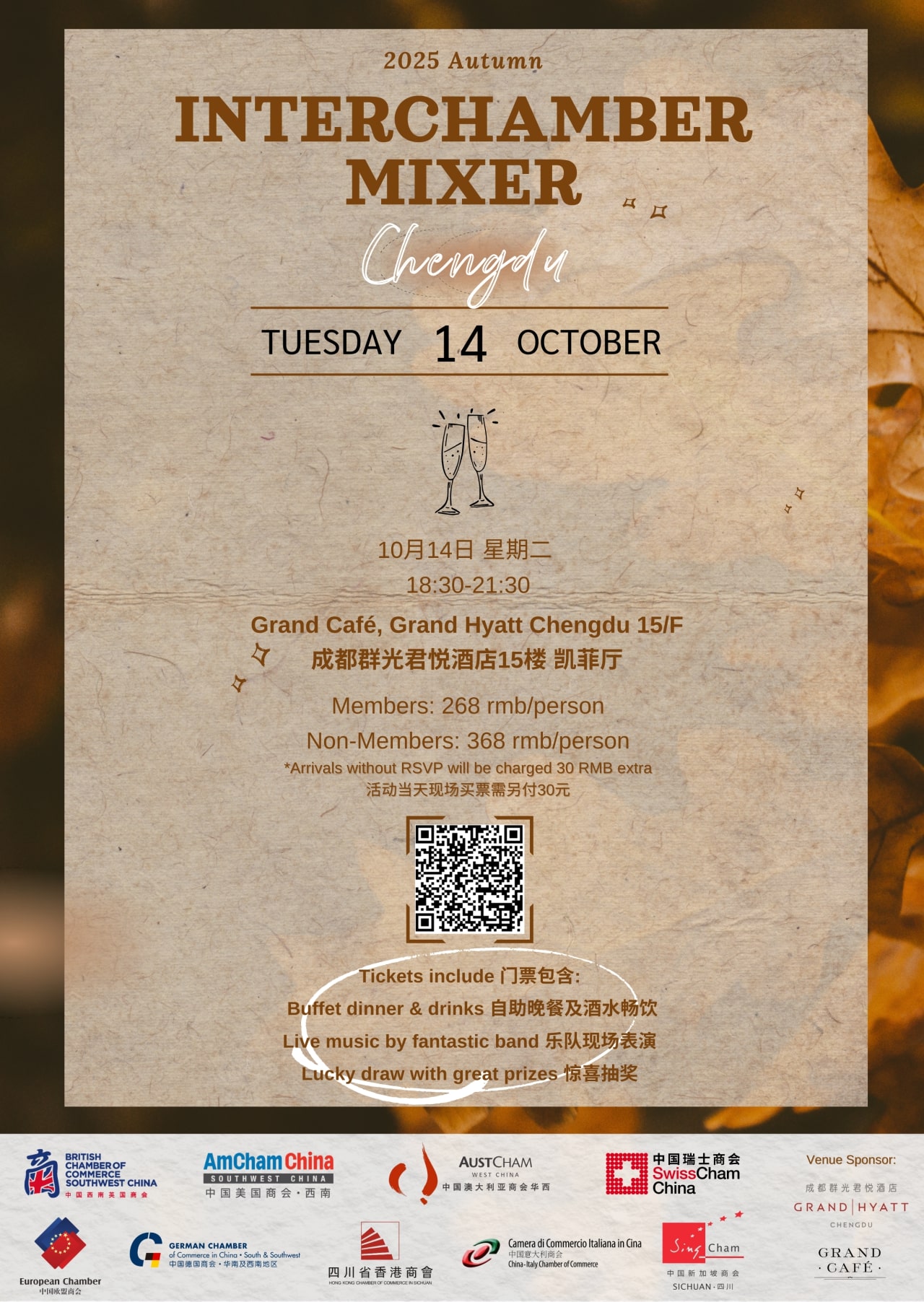 The China-Italy Chamber of Commerce (CICC), in cooperation with the German Chamber of Commerce in China·South & Southwest , the British Chamber of Commerce Southwest China, the China-Australia Chamber of Commerce West China, the European Chamber Southwest China Chapter, the Swiss Chamber of Commerce, Hongkong Chamber of Commerce in Sichuan, AmCham China·Southwest, the Singaore Chamber of Commerce and Industry in China, is glad to invite you to the 2025 Autumn Interchamber Mixer Chengdu which will be held in on