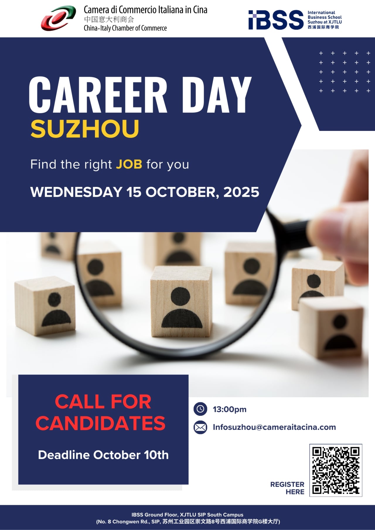 The China-Italy Chamber of Commerce (CICC), in collaboration with XJTLU International Business School Suzhou (IBSS), will host the Career Day in Suzhou on 15th October 2025 at the IBSS Lobby, as part of the 2025 IBSS Autumn Job Fair.