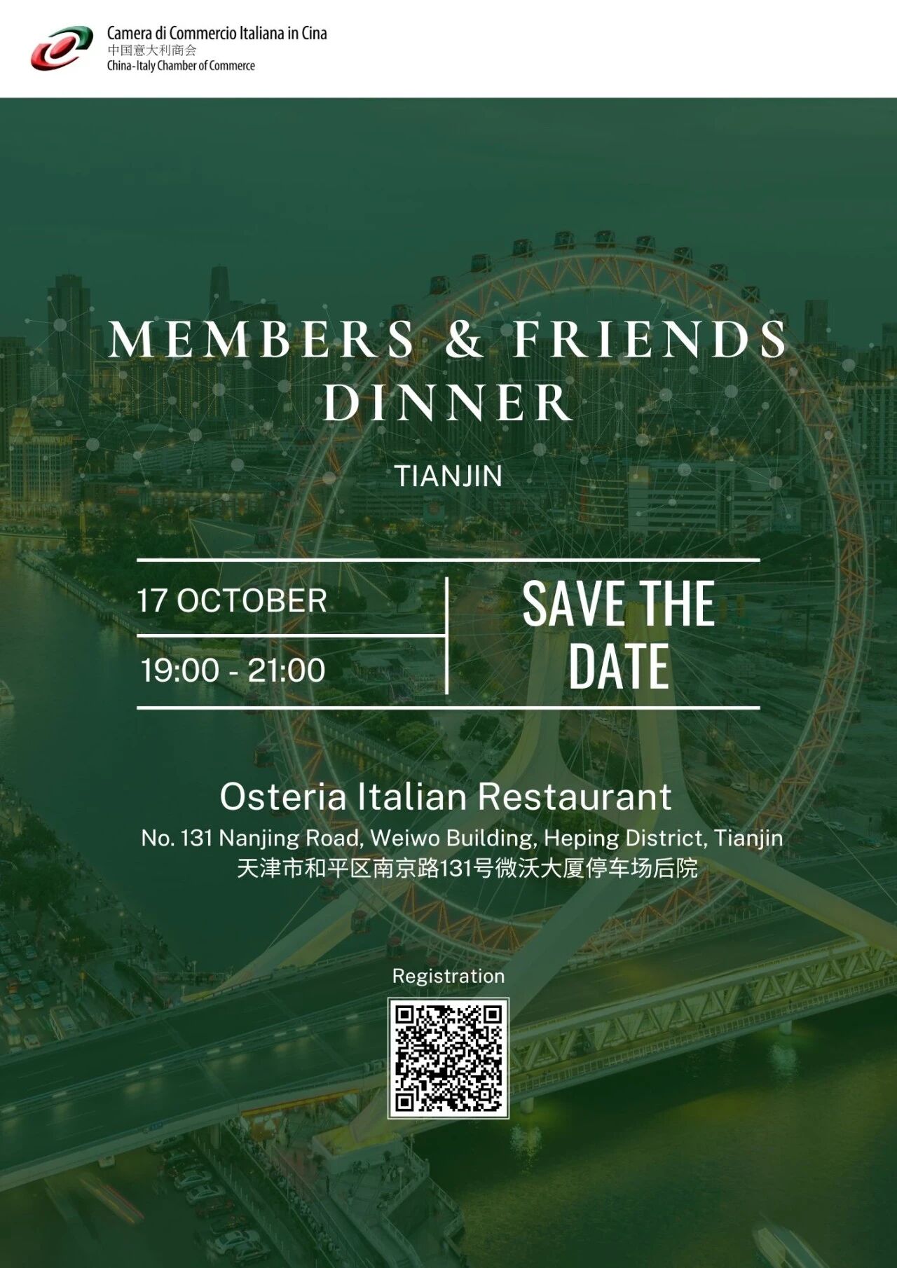 The China-Italy Chamber of Commerce (CICC) is delighted to invite you to the Members & Friends Dinner that will be held on October 17th from 19:00 (China Time) at Osteria Italian Restaurant in Tianjin