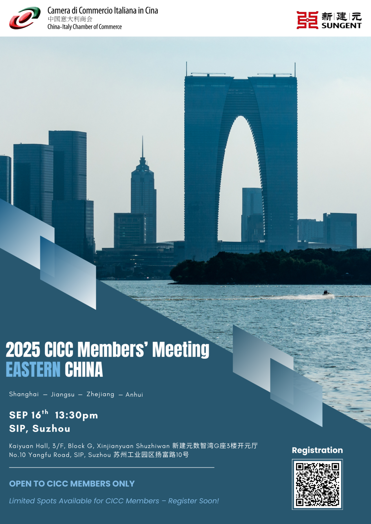 The China-Italy Chamber of Commerce is delighted to invite you to the 2025 CICC Members' Meeting in Eastern China, scheduled for Tuesday, September 16th, 2025, in Suzhou.