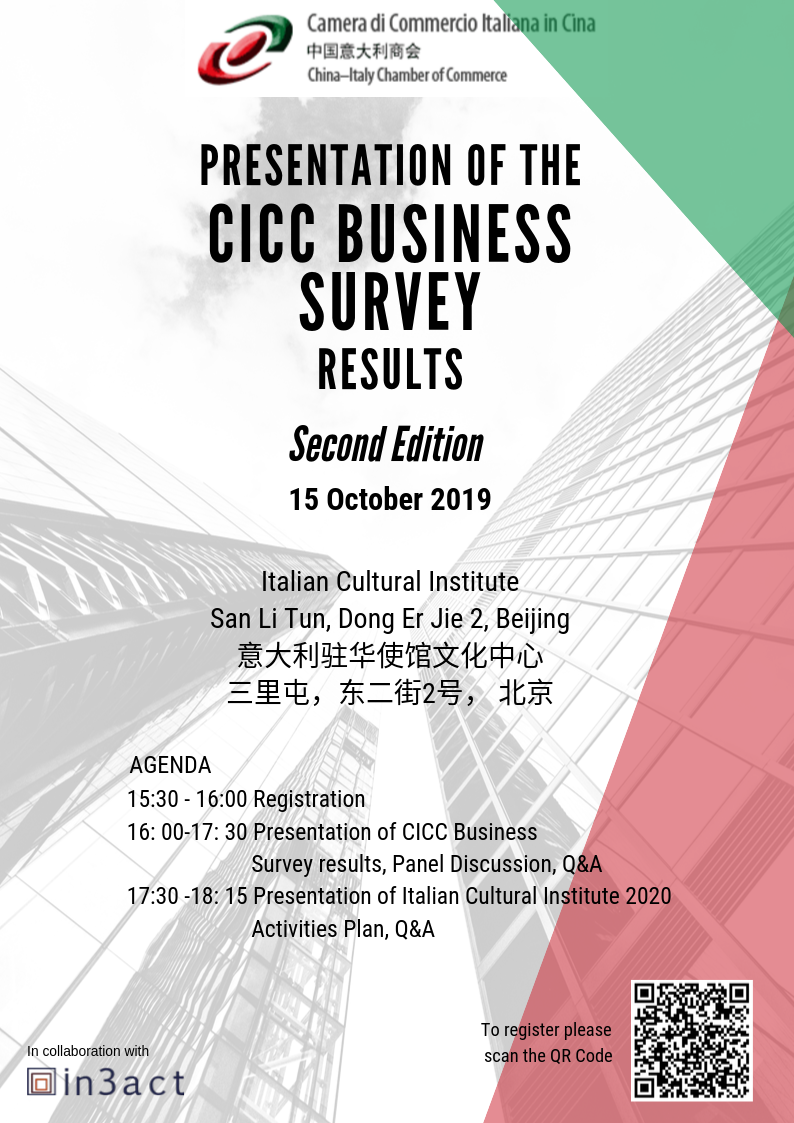 Il Business Survey è stato elaborato dalla CCIC in collaborazione con l'azienda di strategic consulting In3act, con l'obbiettivo di conoscere approfonditamente la comunità imprenditoriale sino-italiana e di investigarne l'approccio al mercato cinese e alle prospettive future. Il Business Survey è stato condotto nel periodo fra maggio e giugno 2019, su un campione di 206 membri della business community.