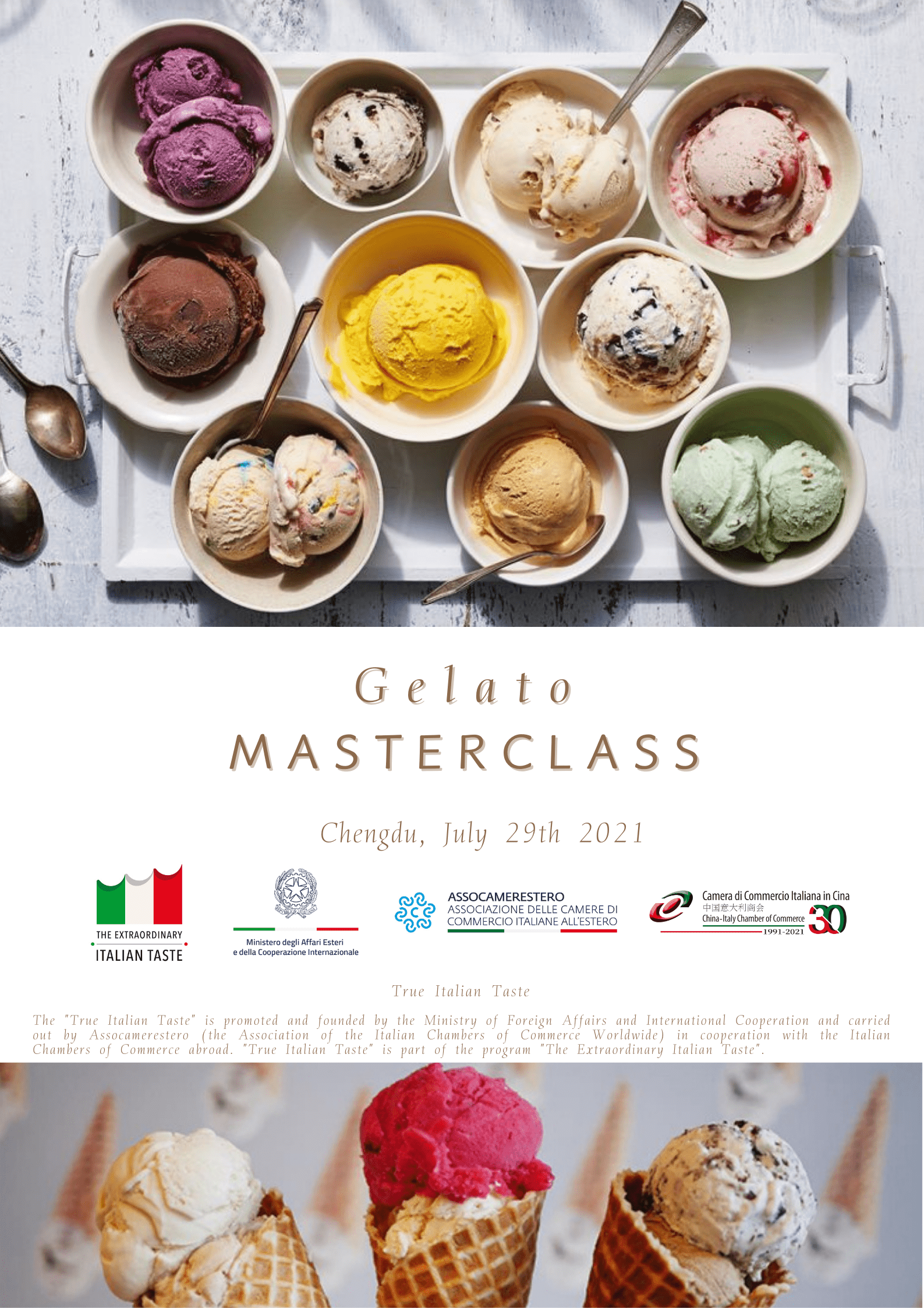 The China-Italy Chamber of Commerce (CICC) is pleased to announce that on July 29th, 2021 the event "Gelato Masterclass" will be held in Chengdu at Sino-Italian Cultural Exchange  Exhibition Hall (No.168, Group 5, Hongxiang, Jiancha street, Tianfu New District, Sichuan).