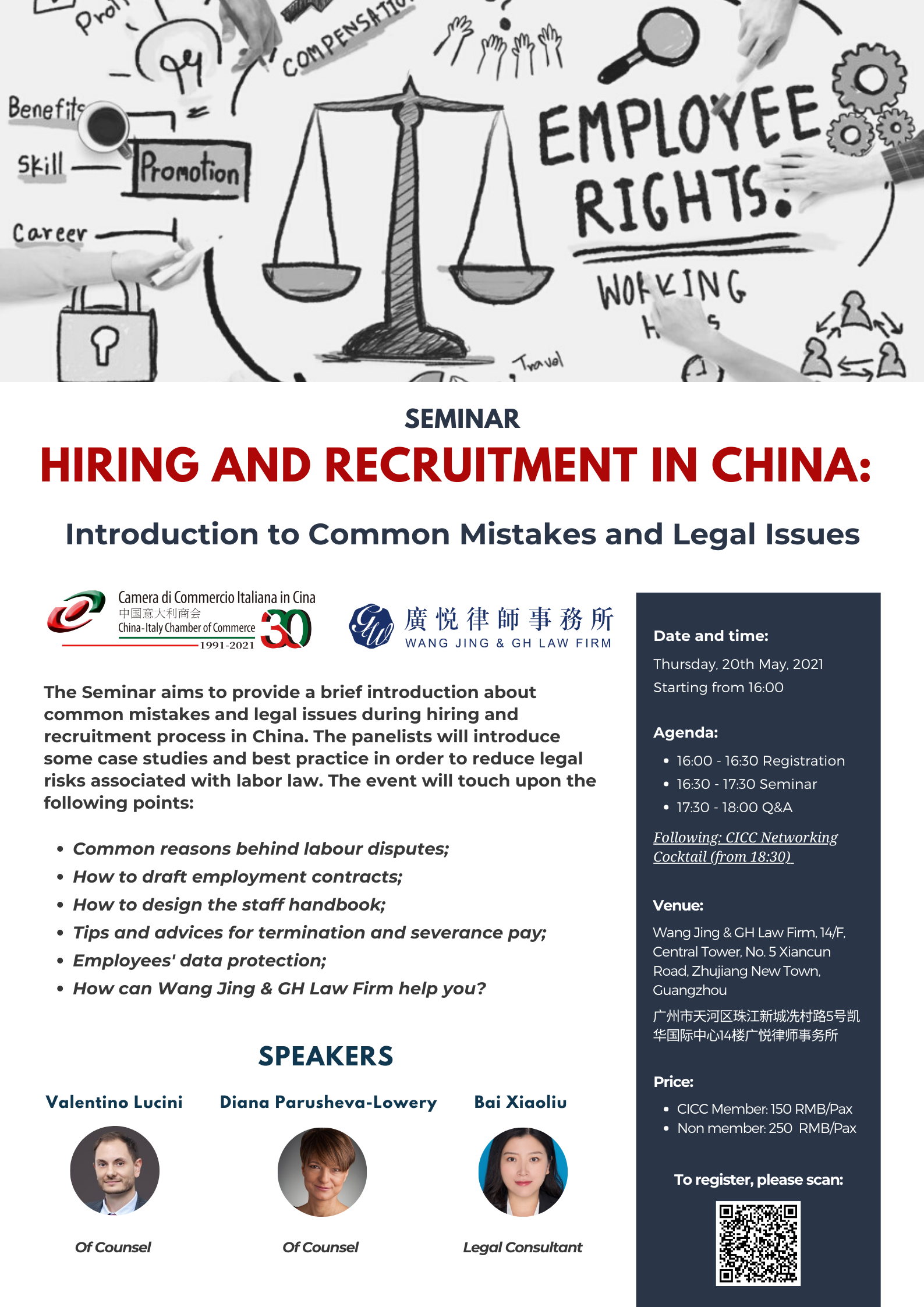 The China-Italy Chamber of Commerce (CICC) is glad to inform you that the Seminar "Hiring and Recruitment in China: Introduction to Common Mistakes and Legal Issues" will be held on May 20th, 2021, starting from 16:00 at Wang Jing & GH Law Firm in Guangzhou. It will be followed by the CICC Networking Cocktail at Buongiorno Guangzhou, starting from 18:30.