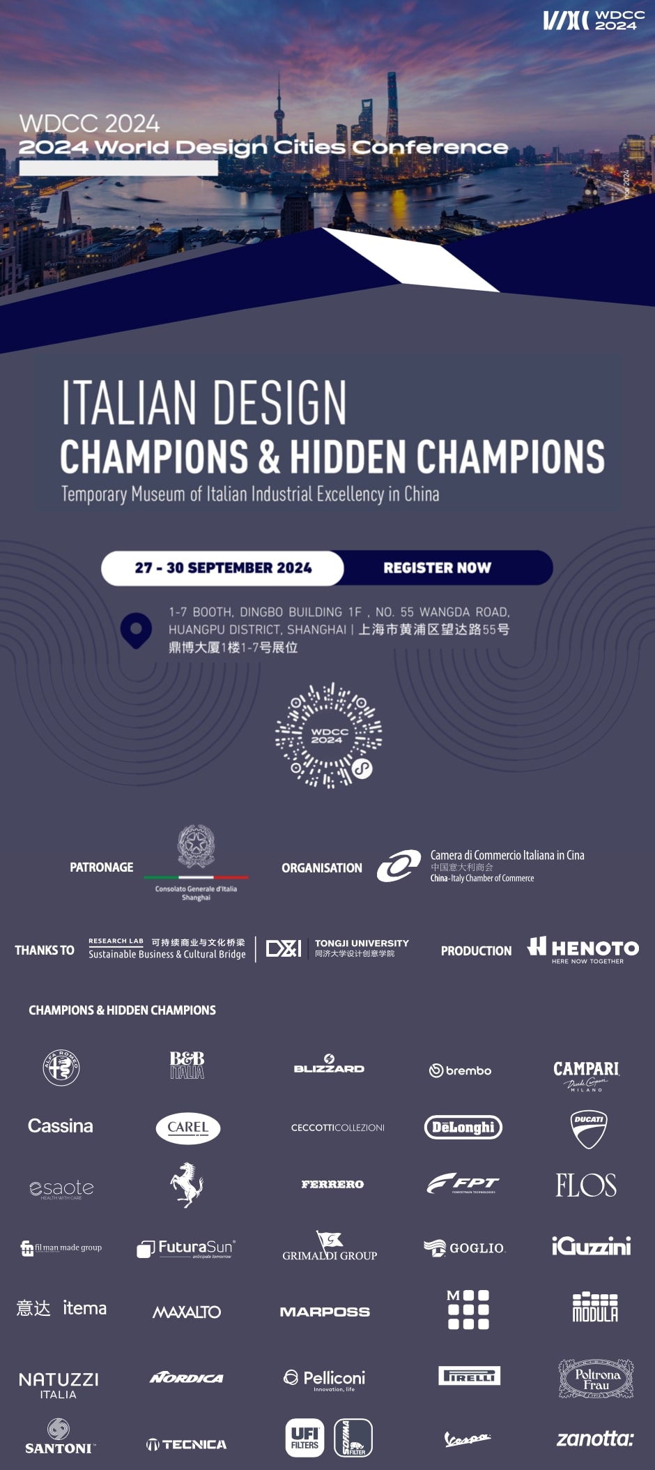 The China-Italy Chamber of Commerce is pleased to invite you to visit the "Italian Design: Champions and Hidden Champions", a Temporary Museum of Italian Industrial Excellence in China, taking place from September 27th to 30th during the World Design Cities Conference (WDCC)  2024 in Shanghai.
