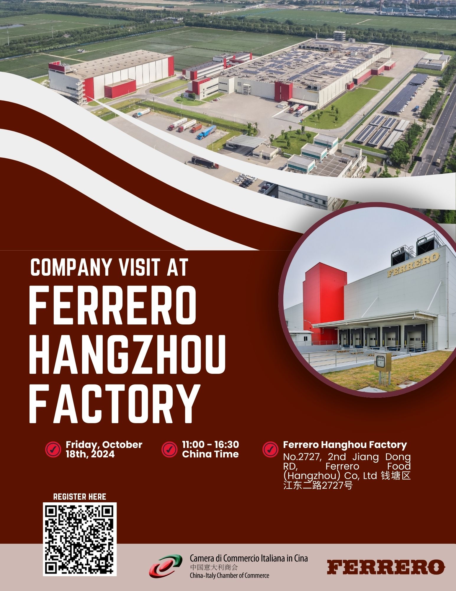 Save the date for the new event in Company Visit Series. Organized by the China-Italy Chamber of Commerce in collaboration with CICC WGS and Ferrero Hangzhou Factory, the event will take place on 18th October 2024 in Hangzhou, Zhejiang Province.