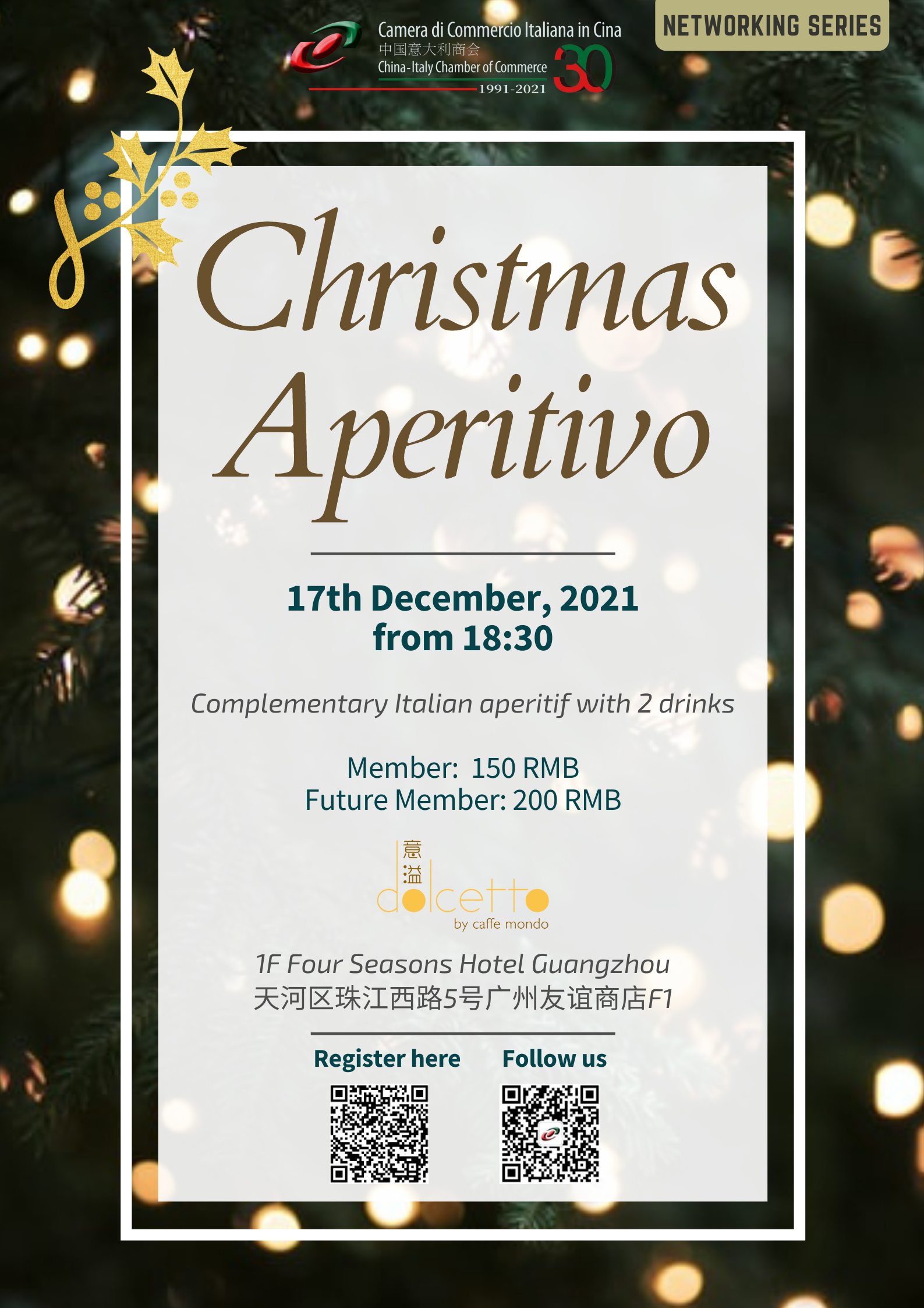 The China-Italy Chamber of Commerce is pleased to invite you to our Christmas Aperitif in Guangzhou.