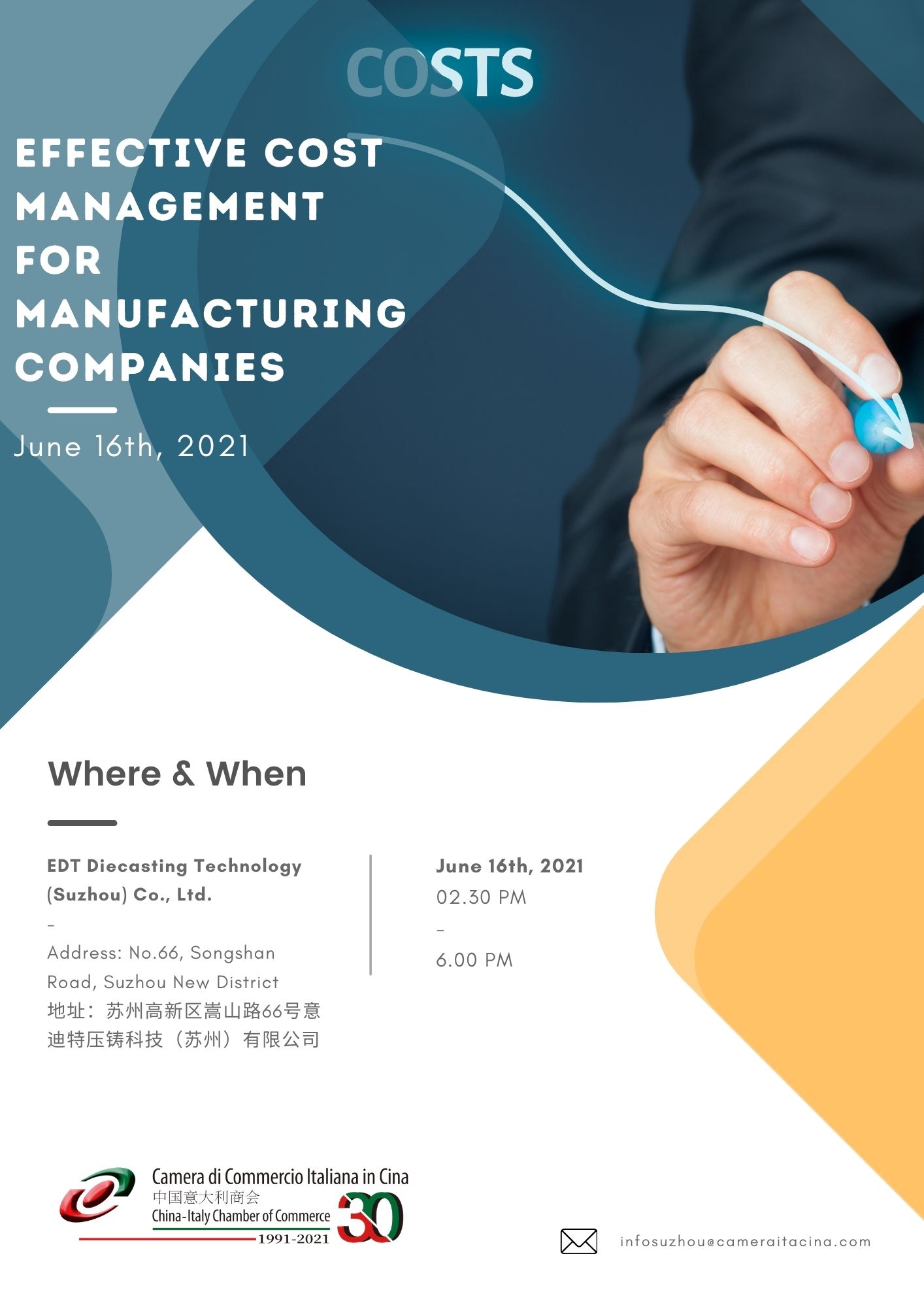 The China-Italy Chamber of Commerce (CICC) is pleased to announce that the seminar “Effective Cost Management for Manufacturing Companies” will be held at EDT Diecasting Technology (Suzhou) Co., Ltd. on June 16th, 2021.