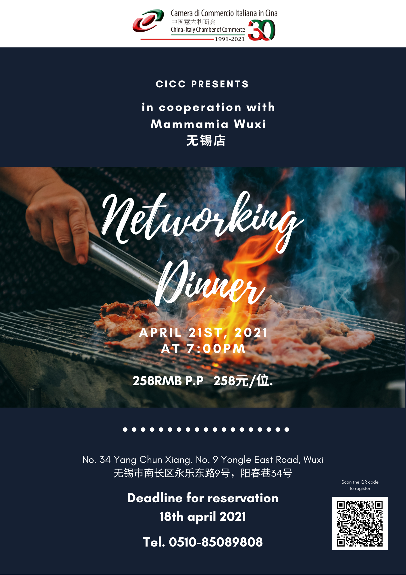 The China-Italy Chamber of Commerce (CICC) is glad to invite you to the CICC Networking Dinner in cooperation with Mammamia Wuxi on 21st April 2021 at 7:00 pm.
