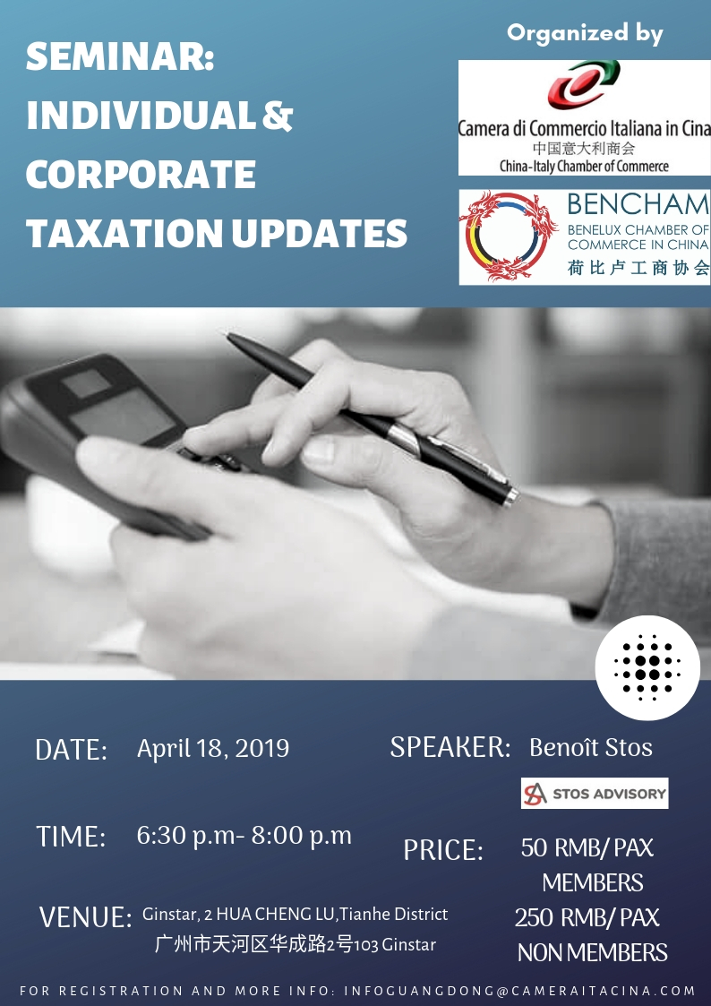 The China-Italy Chamber of Commerce invites you to take part to the Seminar “Individual & Corporate Taxation Updates” to be held in Guangzhou on Thursday April 18th, 2019 at 6:30 p.m.