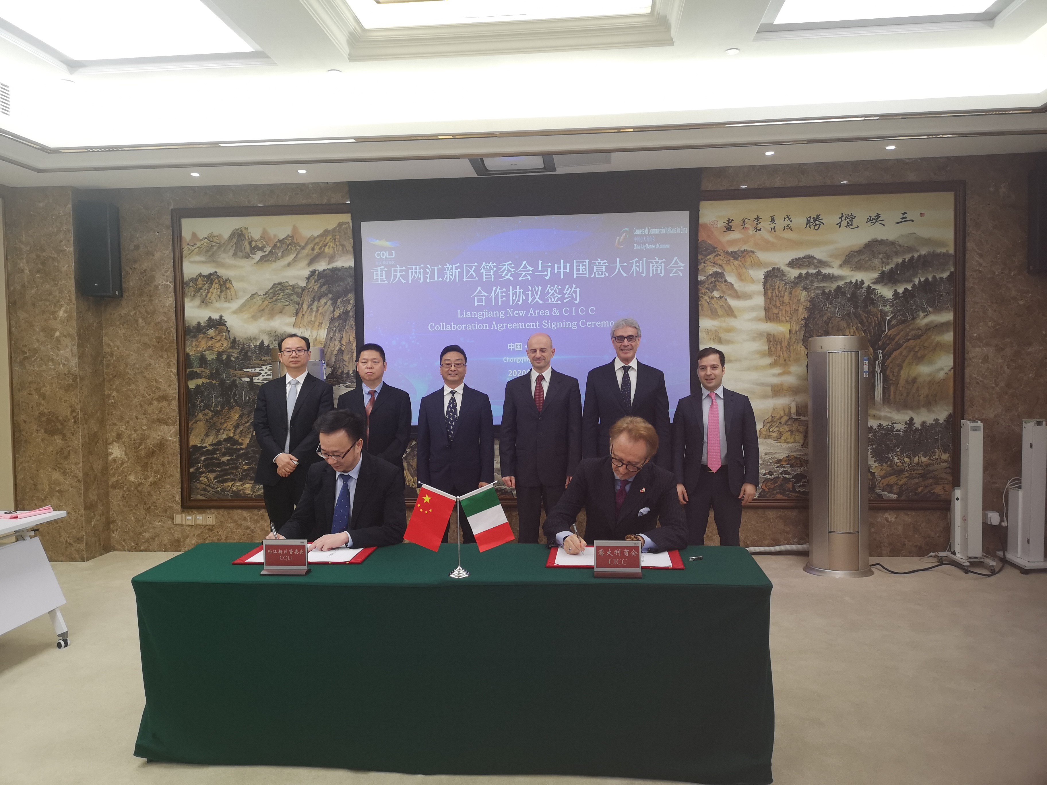 Cerimonia per la firma dell'accordo di cooperazione per gli investimenti del 2020 tra Liangjiang New Area Investment Invitation Group (LJNAIIG) e la Camera di Commercio Italiana in Cina (CCIC)