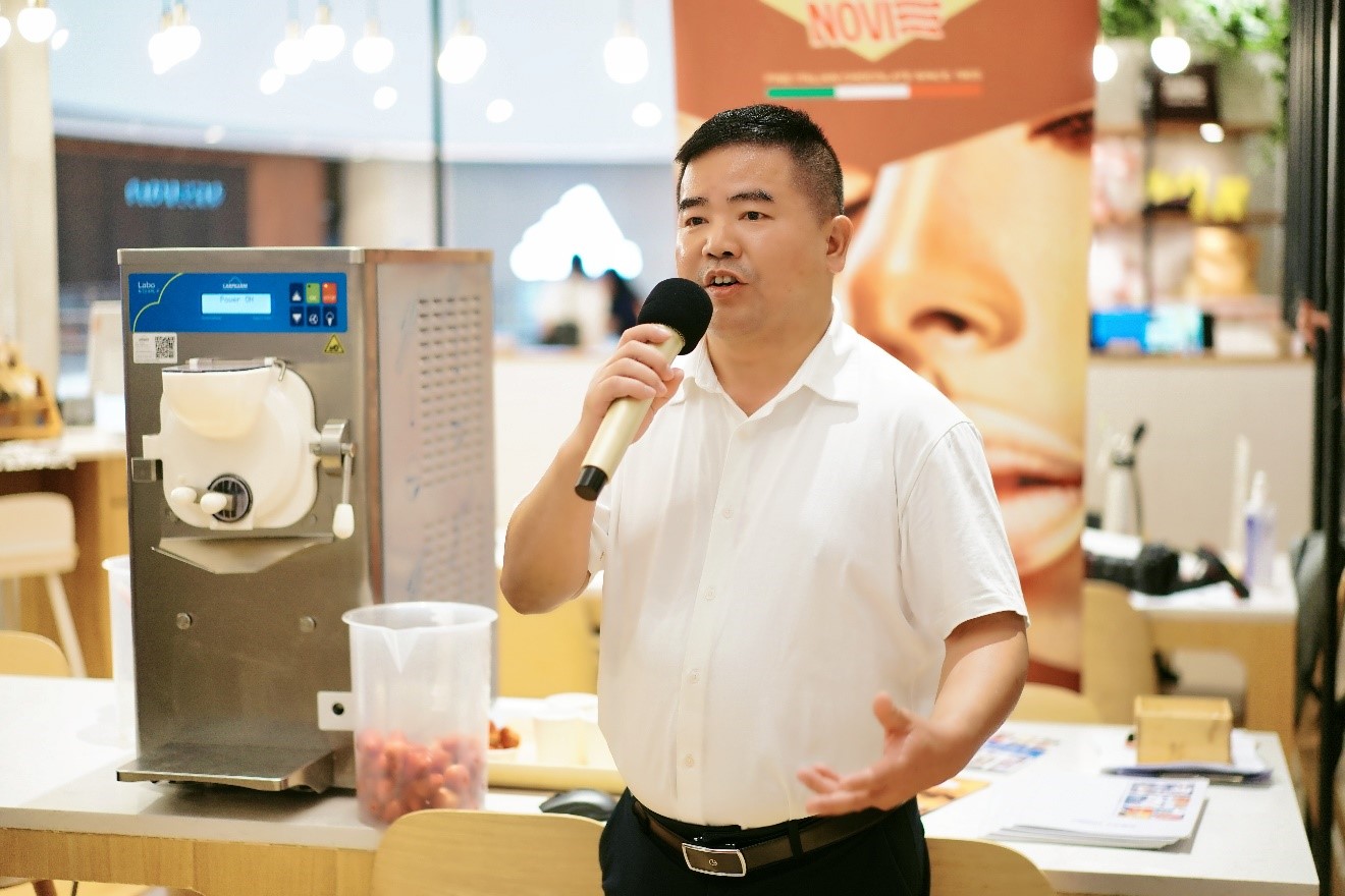 After the chocolate presentation, the participants went back to continue their dishes. When the DIY session was almost at the end, Mr Welling Zhang of Carpigiani, introduced the Gelato machine to the audience, showing how to do the strawberry sorbetto with their professional and advanced machine, which was a unique experience for the guests.